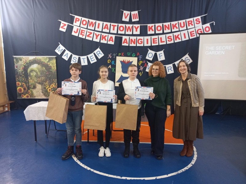 27 listopada 2025r. odbył się w naszej szkole VIII Powiatowy Konkurs z Języka Angielskiego "Master of Words". Do rywalizacji przystąpili uczniowie kl.5-6 z 6 szkół naszego powiatu. Każdą szkołę mogło reprezentować dwoje uczniów. Zadania konkursowe obejmowały: dyktando, quiz językowy oraz literowanie wylosowanych wyrazów na czas. Laureatami konkursu zostali: