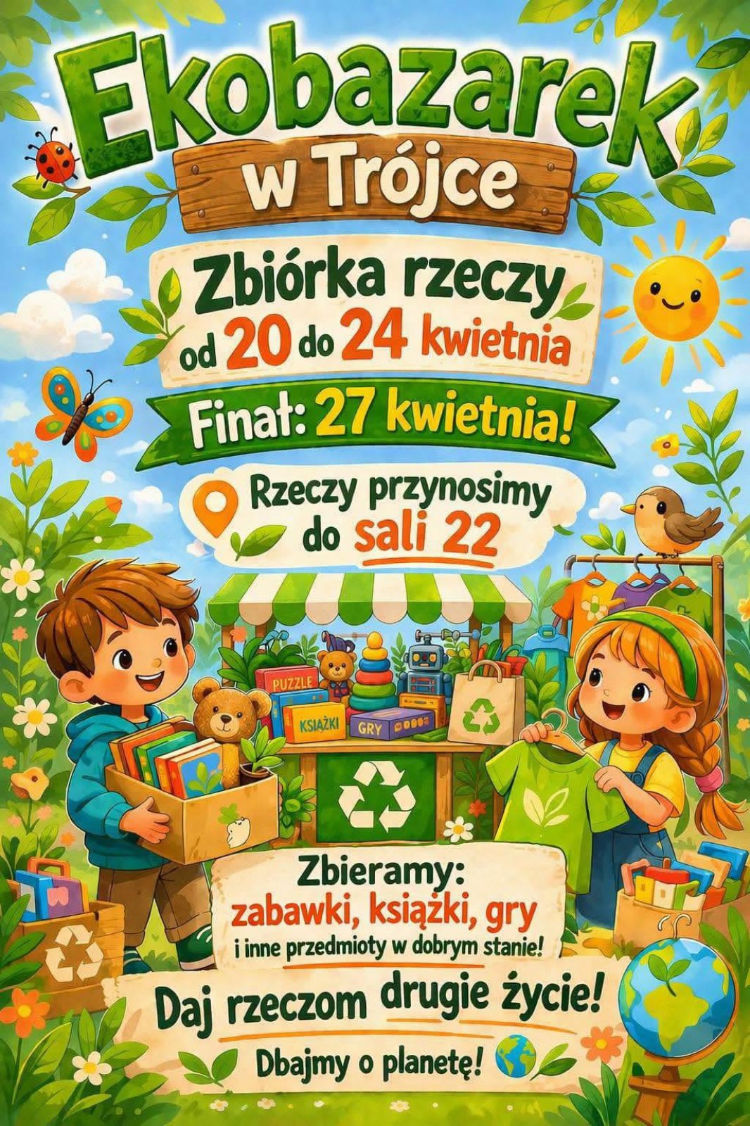 Z okazji nadchodzącego Dnia Ziemi w naszej szkole organizowany jest Eko Bazarek – szkolny punkt wymiany rzeczy używanych i niepotrzebnych, takich jak przybory szkolne książki gry czy zabawki puzzle. Akcja odbywa się w duchu zero waste i ma na celu promowanie ponownego wykorzystania przedmiotów oraz troski o środowisko.