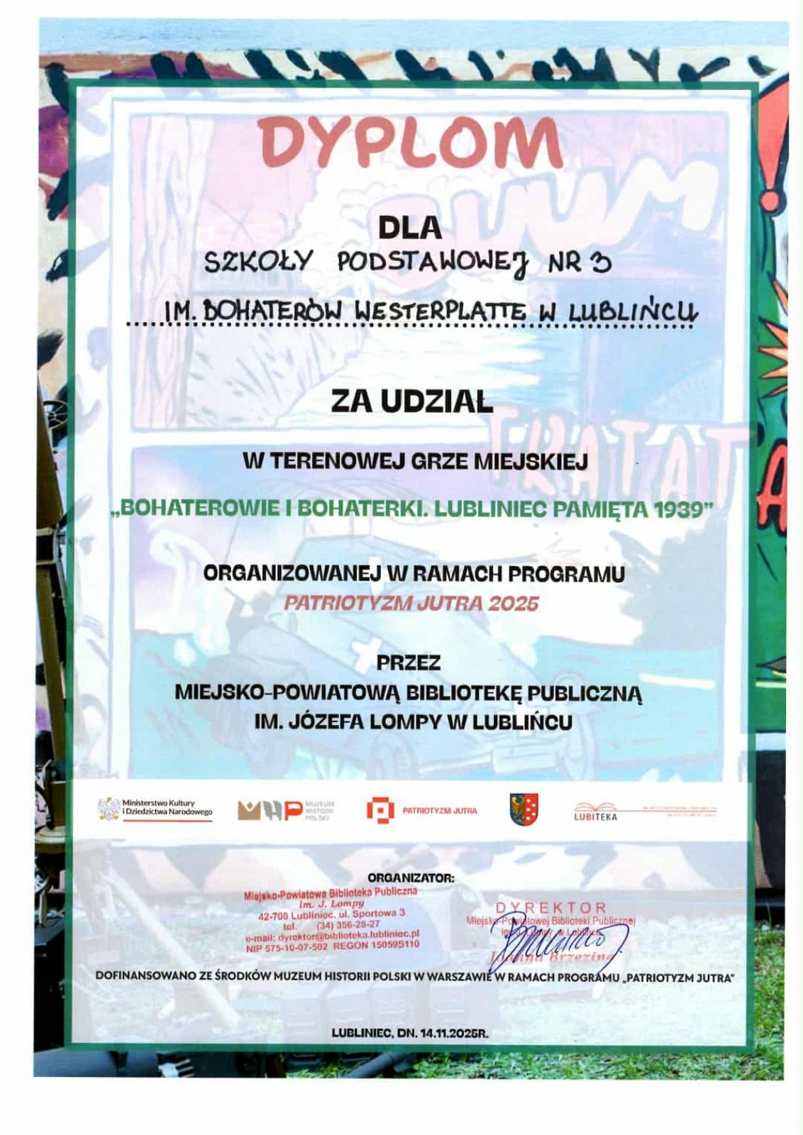 W piątek, 14 listopada uczniowie naszej szkoły wzięli udział w grze miejskiej "Bohaterowie i bohaterki. Lubliniec pamięta 1939" organizowanej przez Miejsko - Powiatową Bibliotekę Publiczną w Lublińcu. Gra organizowana była w ramach programu "Patriotyzm jutra 2025". W grze brało udział 8 drużyn. W każdej drużynie znalazły się osoby z różnych szkół. Każda grupa miała do wykonania wiele ciekawych zadań w terenie. Poprzez zabawę zdobyli wiedzę na temat historii Lublińca i bohaterów walk z okresu II wojny światowej. Był to też dobry moment do integracji uczniów z różnych szkół. Wspólne działania przyniosły także rezultaty. Maciej Piłkowski znalazł się w drużynie, która zdobyła I miejsce, Alicja Ostrowska natomiast II miejsce. Na koniec każdy uczestnik mógł także spróbować swych sił na wirtualnej strzelnicy. Wszystkim uczestnikom gratulujemy, a pracownikom Biblioteki dziękujemy za zaproszenie i zorganizowanie przedsięwzięcia.
