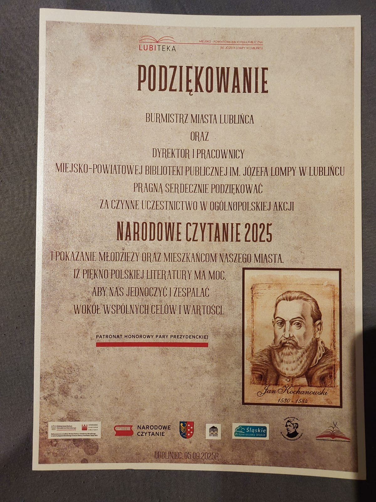 Narodowe Czytanie nieprzerwanie się rozwija i przynosi wiele przyjemności wszystkim jego współtwórcom i uczestnikom od 2012 roku. Podczas tegorocznej, czternastej edycji Narodowego Czytania, pani mgr Aleksandra Szokalska oraz pani mgr Agnieszka Biernacka spotkały się w Lubitece, w sobotę 6 września 2025 roku, aby odkryć wyjątkowe przesłanie poezji Jana Kochanowskiego.