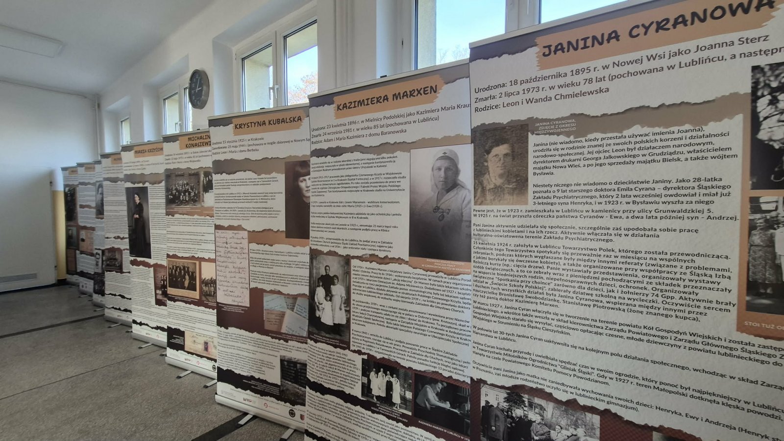 Na początku marca, dzięki uprzejmości Miejskiej Biblioteki Publicznej w Lublińcu, w naszej szkole eksponowana była wystawa pt. „Niepodległe i niezwykłe kobiety II RP”. Jej celem było przybliżenie społeczności szkolnej wybitnych Polek, które swoją działalnością przyczyniły się do rozwoju i umacniania polskości na terenie Lublińca i okolic w okresie międzywojennym. Autorzy wystawy: Bartłomiej Zbączyniak (przygotowanie merytoryczne) i Katarzyna Lubosz (opracowanie graficzne) przedstawili sylwetki trzynastu kobiet zaangażowanych m.in. w walkę o niepodległość, działalność społeczną, edukacjną, harcerską czy charytatywną. Zwiedzający mogli zapoznać się z planszami informacyjnymi zawierającymi fotografie oraz krótkie opisy osiągnięć i życiorysów m.in. Wiktorii Niegolewskiej, Marii Krzyżowskiej, Józefy Liberkowej, Janiny Cyranowej, Heleny Tyran czy Krystyny Kubalskiej.