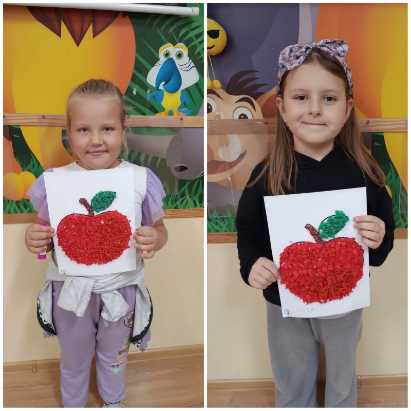 Dzieci wykonywały również prace plastyczne- wydzieranki z bibuły. Celem zajęć i wspólnej zabawy była integracja wszystkich Świetliczków, zachęcenie do spożywania owoców, a w szczególności jabłek pod różnymi postaciami . Dzień Jabłkowy zaliczamy do bardzo udanych i zachęcamy wszystkich do jedzenia jabłek, bo to źródło zdrowia i witamin.